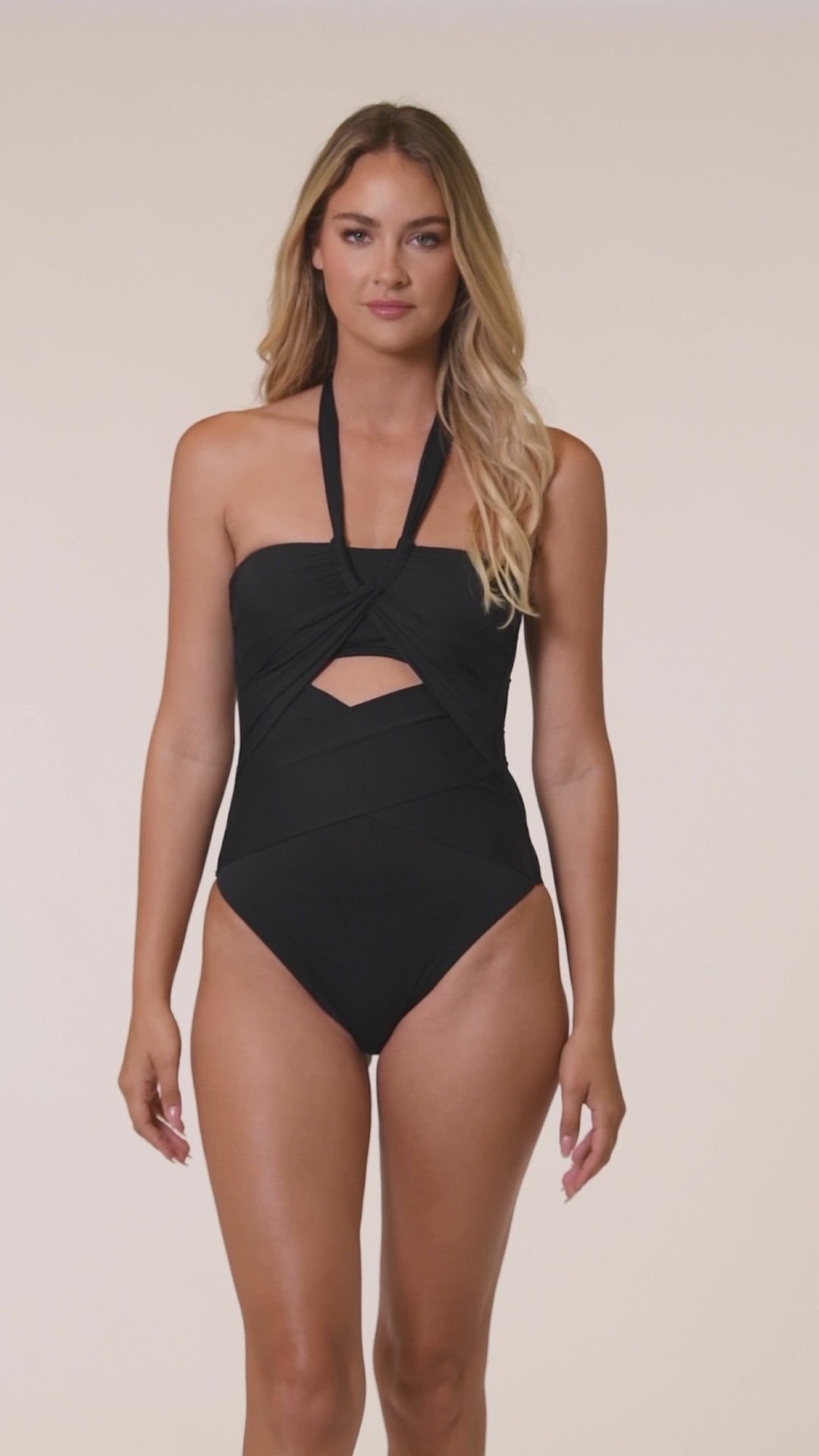 This figure-enhancing suit showcases an elegant halter neck design with front draping, creating a keyhole cut-out, lending a sophisticated yet alluring aesthetic. Change the straps to instantly convert the suit into a bandeau and say goodbye to those tan lines. The open back style offers a sleek and smooth silhouette that enhances the garment’s chic appeal.